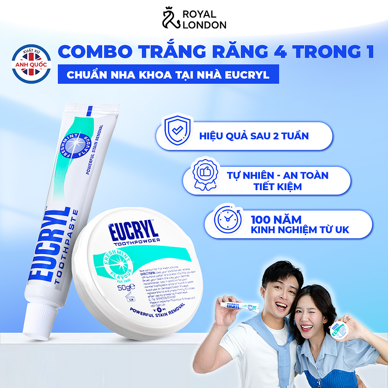 Thay vì tốn kém chi phí tẩy trắng tại nha khoa, Combo trắng răng Eucryl mang đến một giải pháp đơn giản, an toàn và hiệu quả ngay tại nhà. Đây là sản phẩm nổi tiếng từ Anh Quốc với hơn 100 năm kinh nghiệm trong lĩnh vực chăm sóc răng miệng, được tin dùng bởi hàng triệu người trên toàn thế giới.