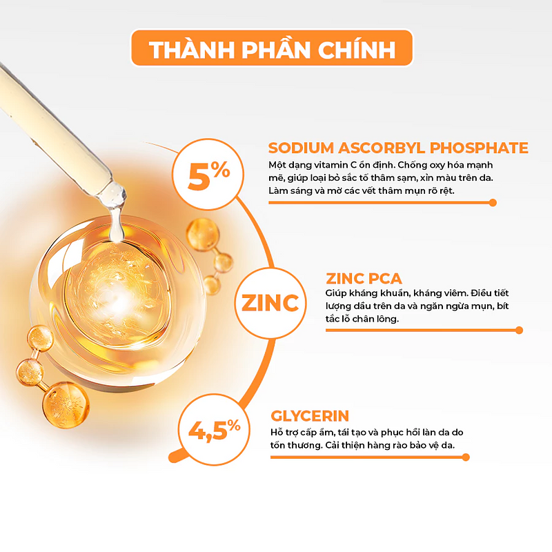 Sự kết hợp giữa Vitamin C – Zinc PCA – Glycerin tạo nên công thức cân bằng: sáng da – ngừa mụn – dưỡng ẩm, đáp ứng nhu cầu của nhiều loại da khác nhau.