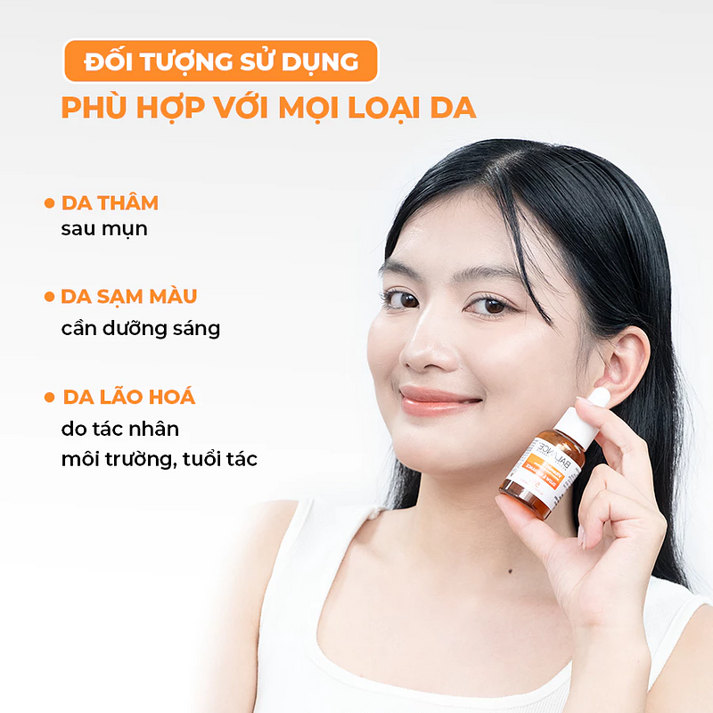 Giúp mờ thâm, đều màu da: Serum giàu vitamin C và các hoạt chất sáng da giúp làm mờ đốm nâu, thâm mụn, cải thiện tình trạng xỉn màu.