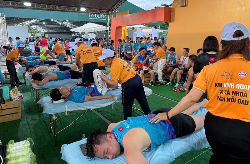 Khu vực massage Tiger Balm hút hơn 9.000 runner, với 10.000 miếng dán, lọ cao xoa, dầu xoa được sử dụng, hỗ trợ làm ấm, giãn cơ sau khi về đích.