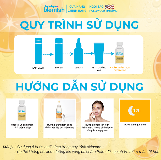 - Sử dụng ở bước cuối cùng trong quy trình skincare. Có thể không bôi kem dưỡng lên vùng da chấm thâm để sản phẩm thẩm thấu tốt hơn.
